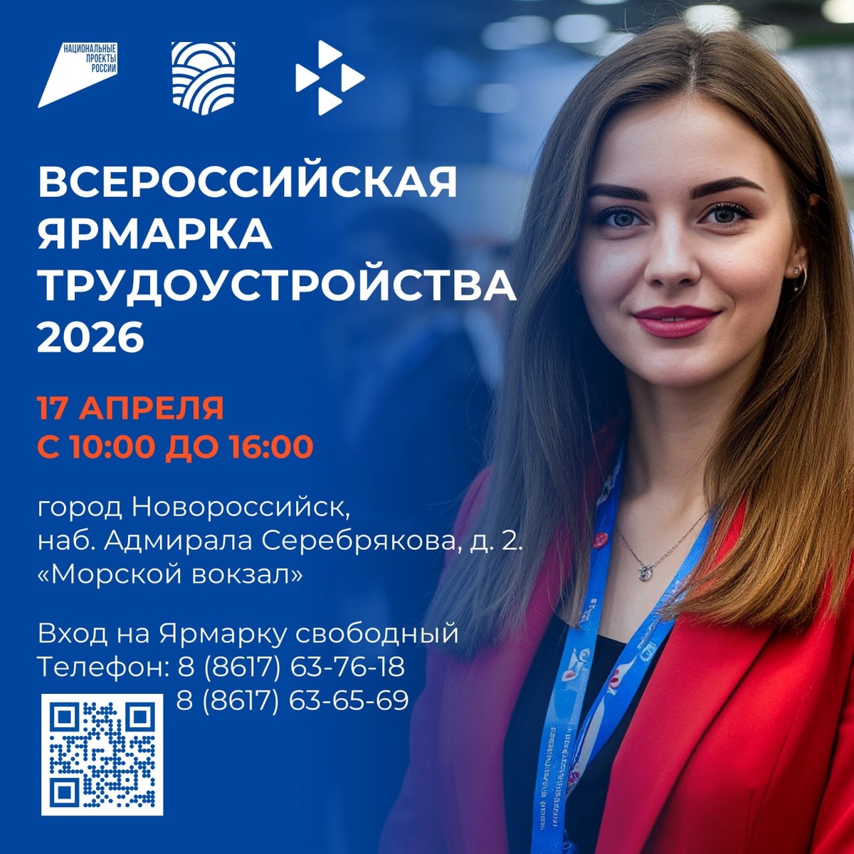 ! Приглашаем вас принять участие во Всероссийской ярмарке трудоустройства «Работа России. Время возможностей». 📅 Дата: 17 апреля 2026 года 🕙 Время: с 10:00 до 16:00 📍 Место: г. Новороссийск, ул. Набережная им. Адмирала Серебрякова, д. 2 («Морской вокзал») Кому будет полезно? Гражданам, ищущим работу, желающим сменить сферу деятельности, студентам, выпускникам, старшеклассникам и их родителям, а также представителям образовательных организаций. Кто участвует? Крупнейшие работодатели города, испытывающие кадровую потребность. Среди участников: АО «Черномортранснефть» ПК «Шесхарис», ООО «Атакайцемент», ЗАО «Абрау-Дюрсо», Администрация МО г. Новороссийск, Следственный отдел УМВД, ОАО «РЖД», ОАО «Новороссцемент», ООО «Салаты с моря», Воинские части, ФКУ СИЗО-3, Пограничная служба ФСБ и многие другие. Вакансии: Электромонтер, электрогазосварщик, водитель погрузчика, машинист крана, слесарь-ремонтник, виноградарь, бухгалтер, экономист, юрист, инженер, врач-методист, ветеринарный врач,