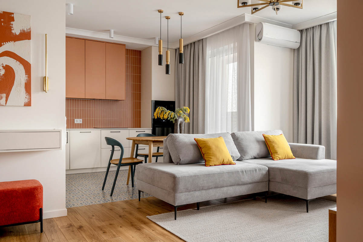 Большая часть мебели, включая кухню, изготовлена по индивидуальному проекту. Кухонный гарнитур выполнен в двух оттенках: базовый тон гармонирует со стенами, а терракотовый создает акцент. Фартук стал главным украшением кухни. Единое цветовое решение плитки и верхних шкафов сразу приковывает взгляд. Остальные элементы выполнены в нейтральных тонах.