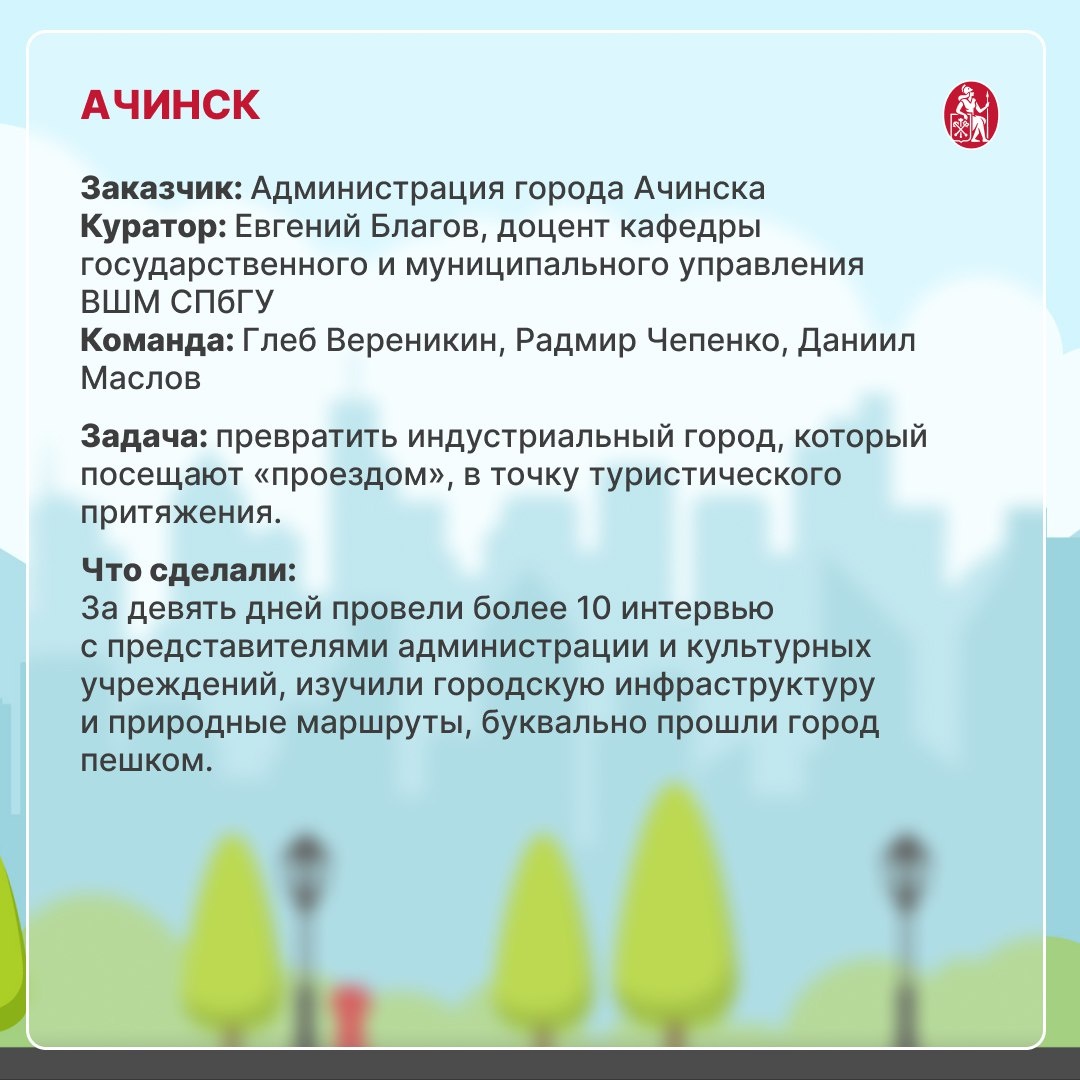 реальных заказчиков. Студенческие команды выезжали в города, проводили полевые исследования, брали интервью, собирали данные и возвращались с готовыми управленческими решениями. Работа строилась по логике консалтингового проекта: от постановки проблемы до защиты результатов перед администрацией. 📆 В 2025 году стажировки прошли в четырёх городах. Каждый со своим контекстом и запросом. Рассказываем о них в карточках. 💬 «Университет может быть не внешним наблюдателем, а полноценным партнёром в городском развитии. Самое ценное – когда территория перестаёт быть объектом изучения и становится пространством совместной работы», – отметила Анастасия Голубева, директор Центра устойчивого развития территорий ВШМ СПбГУ. ⭐ По итогам 2025 года результаты признаны заказчиками полезными. В этом году стажировки пройдут в новых городах. Подробности ищите на сайте. А если хотите узнать больше о стажировках в полях и учёбе в ВШМ СПбГУ, не пропустите День открытых дверей программ бакалавриата. 🔗 Ре