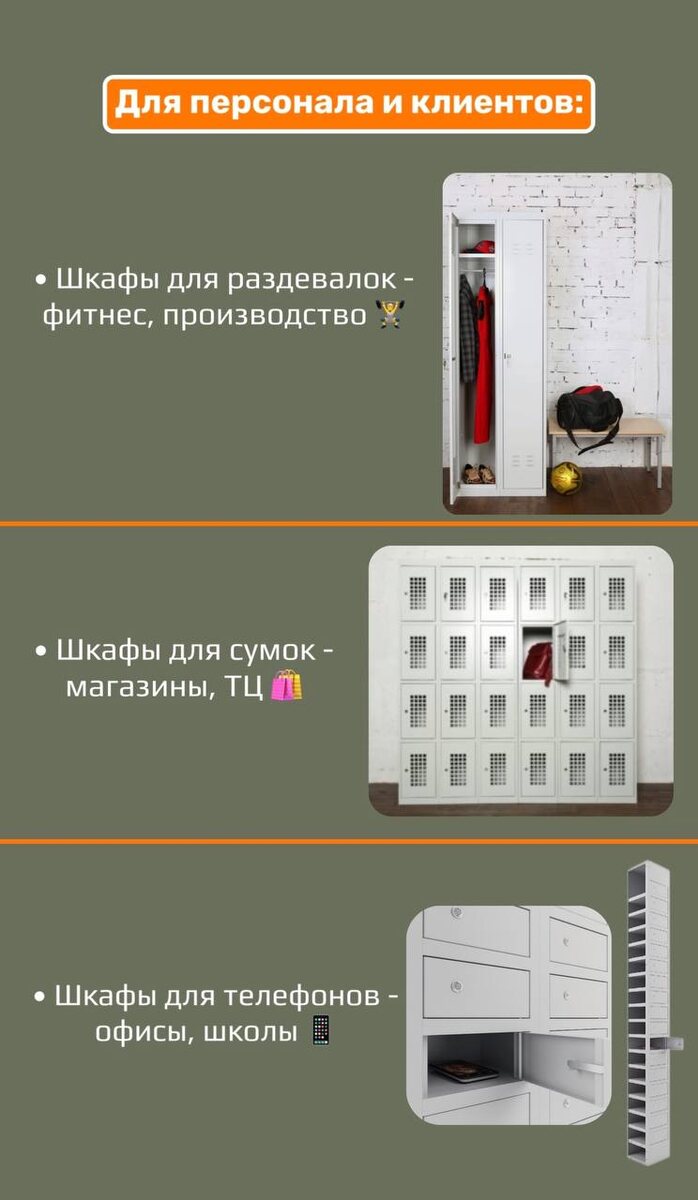 🔐 У нас в наличии: - шкафы для раздевалок (фитнес, производство) - шкафы для сумок (магазины, ТЦ) - шкафы для телефонов (офисы, школы) - шкафы для документов и бухгалтерии - картотеки для архивов и медцентров - офисные шкафы А также: - шкафы для уборочного инвентаря - сушильные шкафы - абонентские шкафы (доставка, e-commerce) - почтовые ящики (ЖК и офисы) - ключницы 👉 Решения для порядка, безопасности и удобства в любом бизнесе Напишите «ШКАФ» - подберём под вашу задачу ✍️ 📲 8-963-504-78-98 📲 8-933-933-79-20 📲 8-933-933-38-71