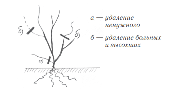 Один раз в 2–3 года прикорневую область следует поливать (лучше ранней весной) растворами уксусной или лимонной кислоты для восстановления кислотности почвы. Осенью после обследования состояния куста необходимо делать санитарную обрезку, как показано на рисунке.