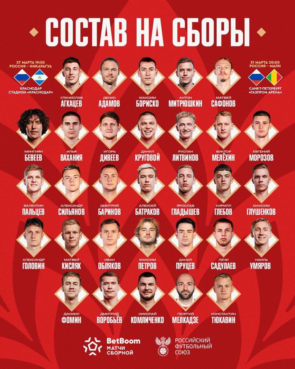 ! Опубликован окончательный состав сборной России на предстоящие товарищеские матчи. Наши футболисты 27 марта в Краснодаре сыграют с соперниками из Никарагуа, а 31-го в Санкт-Петербурге российская команда примет футболистов Мали. @russian_rt_sport