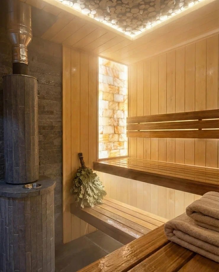 хамама и жаркая сухая финская сауна. Это позволяет легко менять атмосферу парной под настроение и формат парения. Стены и потолок отделаны ольхой с широким профилем TFS, который создаёт аккуратную и спокойную фактуру древесины. Пологи и спинки выполнены из термодревесины, поэтому они не перегреваются и комфортны даже при высокой температуре. Полки сделаны широкими, удобными для парения веником, а нижний ярус — выдвижной. В отделке использованы декоративные элементы: панно из гималайской соли с подсветкой, можжевеловое панно и жаростойкая LED-подсветка по контурам полков и спинок, которая добавляет мягкий свет и подчёркивает геометрию парной.