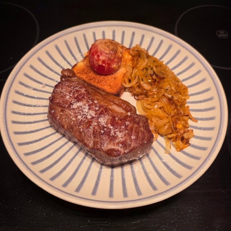 Приветствую вас, любители вкусной кухни! Сегодня я хочу поделиться с вами быстрым и простым рецептом. Давайте взглянем на ингредиенты, которые нам понадобятся: - Ромштекс (стейк должен быть таким толстым, чтобы его можно было удобно разместить на сковороде). - Овощной лук. - Масло с травами. - Веточка розмарина. - Зубчик чеснока. - Хлеб для тостов. - Помидоры. - Немного сыра для запекания вместе с помидорами, а также перец и соль в хлопьях. Начнем с приготовления стейка. Положите его на сковороду жирной стороной вниз, чтобы жир растаял. В процессе добавьте зубчик чеснока и розмарин, обжаривайте по две минуты с каждой стороны. Теперь займемся хлебом. Легко смажьте поджаренный тост маслом с травами, в центре разместите помидор, сделайте надрезы крест-накрест. Сверху положите сыр и готовьте на гриле или во фритюрнице в течение трех с половиной минут. Пока помидоры готовятся, на другой сковороде обжарьте мелко нарезанный лук с добавлением соли, перца, небольшой щепотки паприки и сахара.