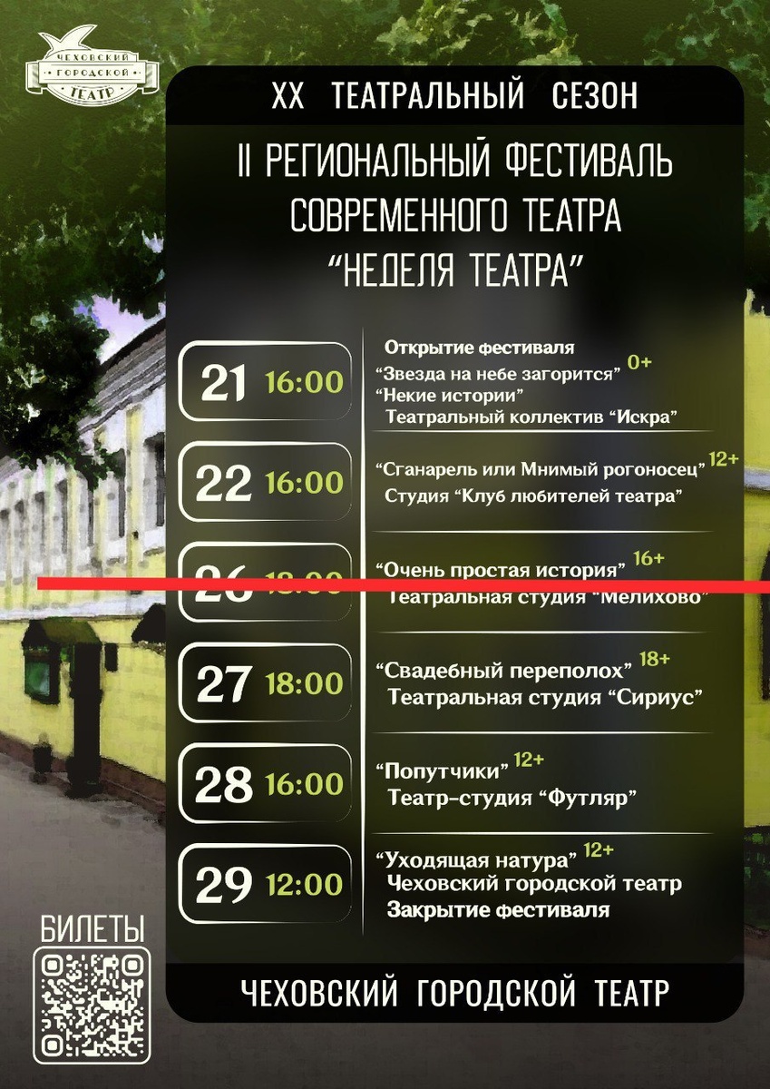 Анонс ранее 👉https://dzen.ru/media/chekhov_events/-festival-sovremennogo-teatra-nedelia-teatra-69b9499906d50a260cd216e0 👉https://vk.ru/wall-217868869_14814 ❗Внимание❗ К сожалению по техническим причинам 26 марта спектакль "Очень простая история" театральной студии "Мелихово" не состоится Все купленные билеты можно вернуть или использовать для посещения других спектаклей фестиваля 🏢 «ЧЕХОВСКИЙ ГОРОДСКОЙ ТЕАТР» 📍 г. Чехов, ул. Московская, д.40 ⭐Поддержать канал голосом ✅ Мероприятия Чехов https://dzen.ru/id/66cc4b48e9ef144699238a51 https://vk.ru/chekhov_events http://dzen.ru/chekhov_events
