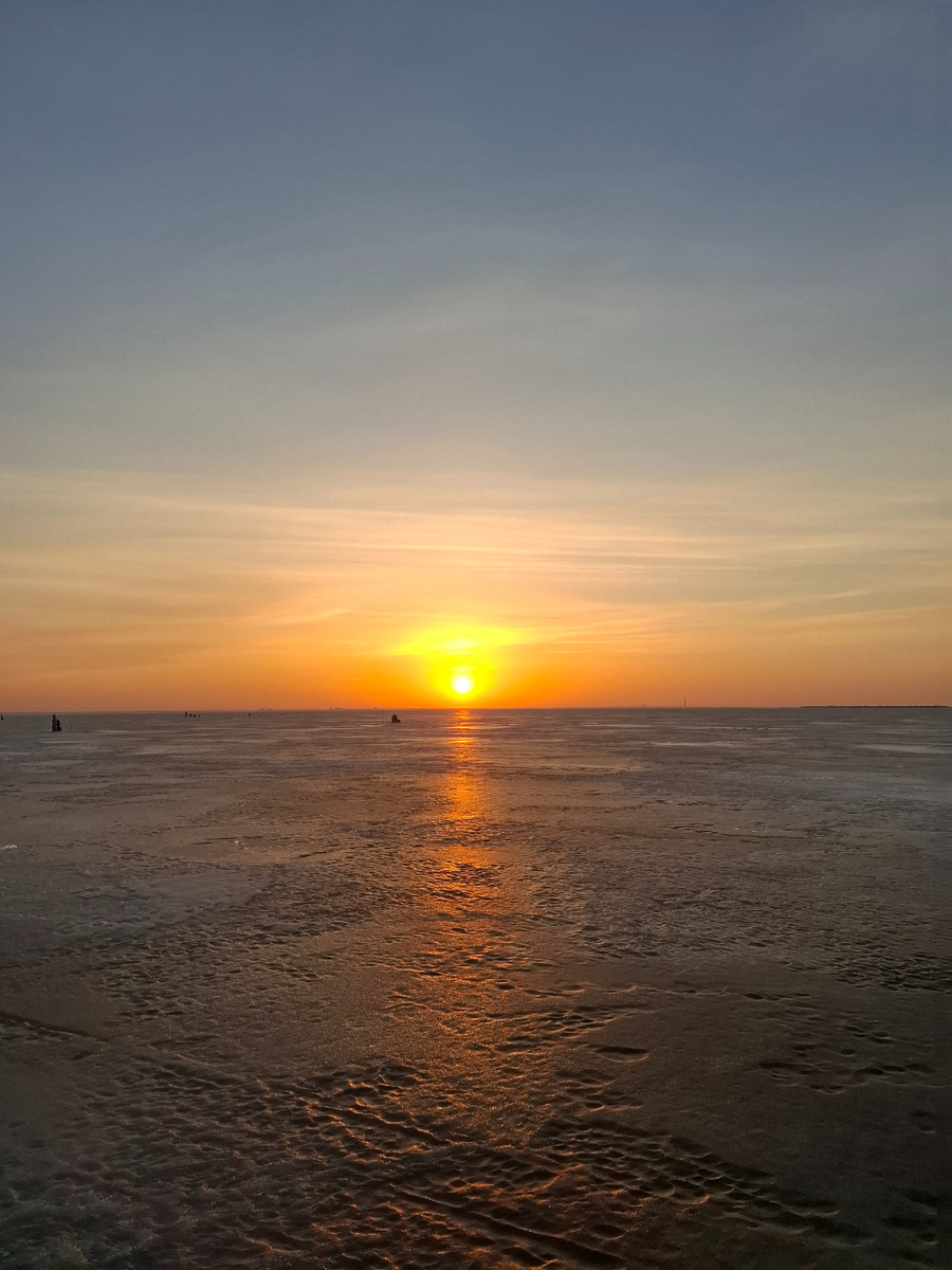 В 6 утра мы прибыли на форт Шанц. Не спешные сборы и уже в 6.30 нас забирает аэролодка. Через 20 минут прибыли на место ловли рыбы. Утренний заморозок хорошо прихватил верхнюю корку льда. Ходить по льду было вполне комфортно. Народ уже присутствовал, но руками пока никто не махал. Мы разошлись в разные стороны в поисках удобной поляны для рыбалки.
