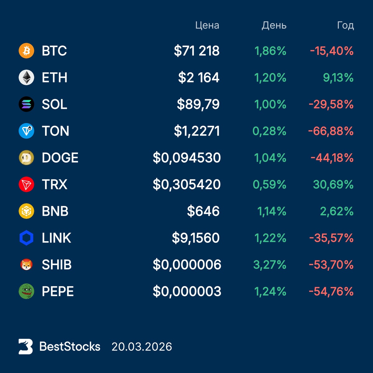 Курсы основных криптовалют: Bitcoin, Etherium, Solana, Toncoin, Dogecoin, TRON, BNB, Chainlink, Pepe, Shiba Inu на текущий момент