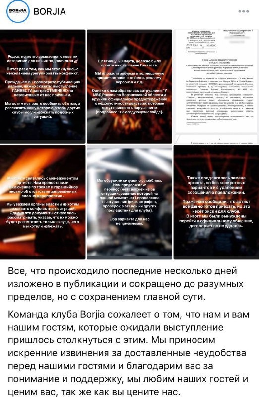 Выступление должно было пройти в клубе Borjia 20-21 марта. Полиция предупредила руководство клуба о наличии пропаганды наркотиков в песнях исполнителя. Менеджер артиста обещал исключить сомнительные строки из программы. Лейбл предлагал перенести дату выступления или взять на себя возможные штрафы. Клуб отверг эти предложения. Несмотря на отмену концерта, средства за билеты будут возвращены слушателям. Гонорар артисту клубом выплачен полностью.
