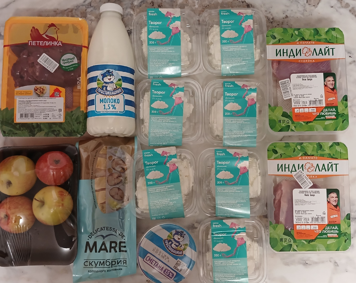 В марте мы питаемся на сумму 70% от прожиточного минимума на питание, Это 250 руб в день на человека, 7750 руб в месяц на одного и 15500 руб на двоих. Еще 171 руб - остаток денег с февраля. И на начало этой недели у меня было 5 192 руб на продукты. я рассказывала, что Озон Фреш дал и мне, и мужу скидку 30% на три заказа. Итого 6 заказов. Вот два последних заказа по этому предложению я сделала на этой неделе. заказ 1 творог, индейка, печенка куриная, скумбрия копченая, молоко и яблоки творог я купила уже для творожной пасхи. Пасха в этом году ранняя, так что творог уже скоро пригодится. Пока убрала весь в морозилку. Творог Домашний по 65,5 руб/200 г, 330 руб/кг, у меня 7 упаковок (=1,4 кг) сметана 42 руб, молоко 19,5 руб (из раздела Съеште скорее+скидка по купону) филе бедра индейки 205 руб/400 г (512 руб/кг) печень куриная 128 руб/уп яблоки 34 руб/0,5 кг скумбрия копченая 187 руб Доставка стоила 125 руб заказ 2 в этом заказе покупала некоторые продукты для стола на день рождения сына