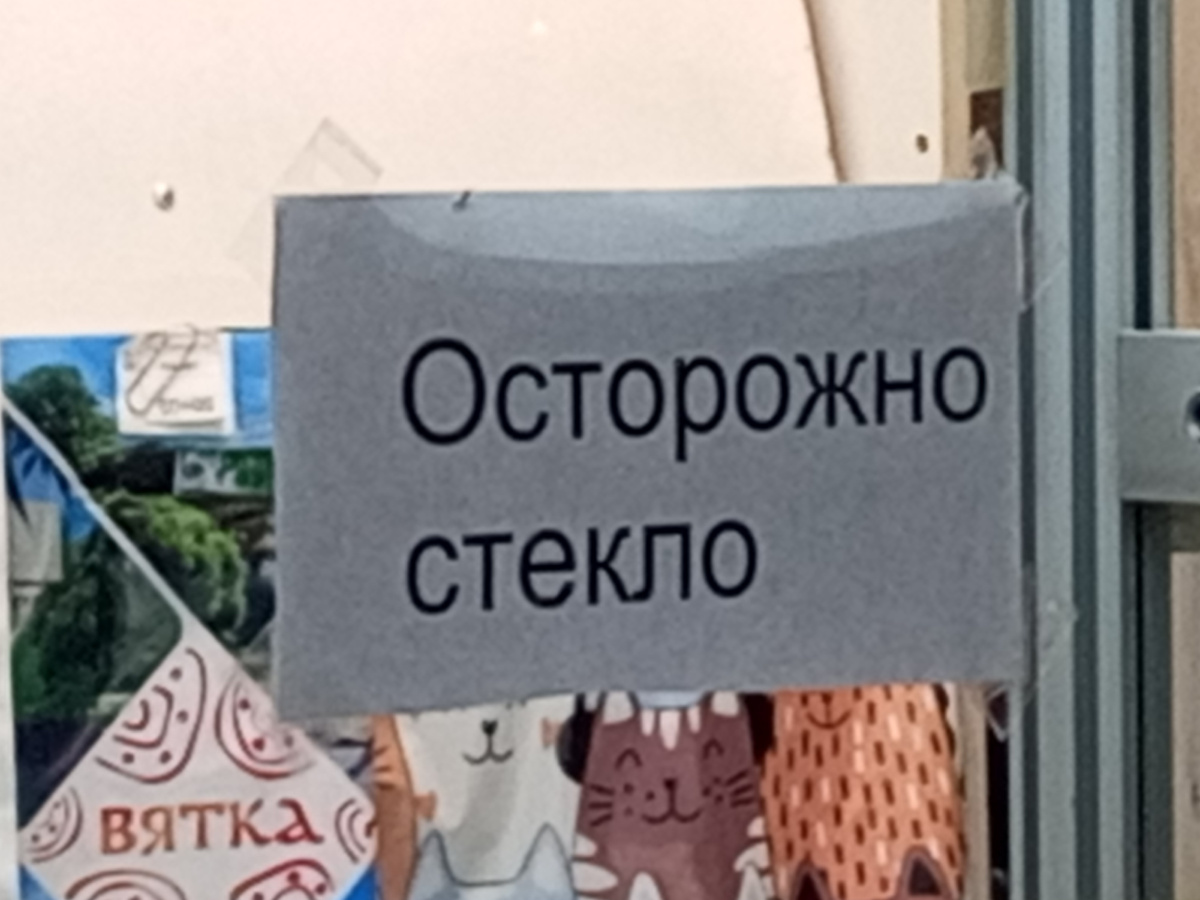 Вернулся к нему и....на стеклянном, ярко освещённом "фасаде" прочел, крупным шрифтом напечатанное объявление "Осторожно стекло". Нет! Я не ошибся! Там и правда не было ни одного знака препинания, из-за чего суть написанного стала двоякой, а посыл надписи, обезличенным!