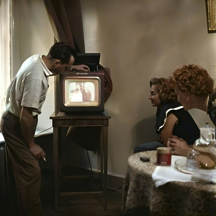 Конец 50-х, фото раскрашено. Установка и настройка приобретенного телевизора Авангард. Смешно — раскрашивая черно-белое фото, программа попыталась раскрасить и изображение в черно-белом телевизоре. Но интересна фотография не этим. Здесь мы видим уникальный, по сегодняшним меркам, процесс зарабатывания денег. В те годы считалось, что если покупается стационарная радиола, а тем более, телевизор, то непременно «специалист должен установить». Приглашался знакомый или рекомендуемый через сарафанное радио «специалист», которому платили от 3 до 10 (!) рублей (после реформы 1961), за «установку», куда входило, внимание: поставить покупку в удобное место, включить в розетку, подключить антенну, или соорудить ее из куска провода, подвесив к карнизу шторы, включить, проверить настройки, настроить какие-нибудь станции, показать как работает. В случае телевизора - отрегулировать яркость, контрастность, настроить программы. Всё. Никаких специфических манипуляций, никаких подстроек внутри, недоступны