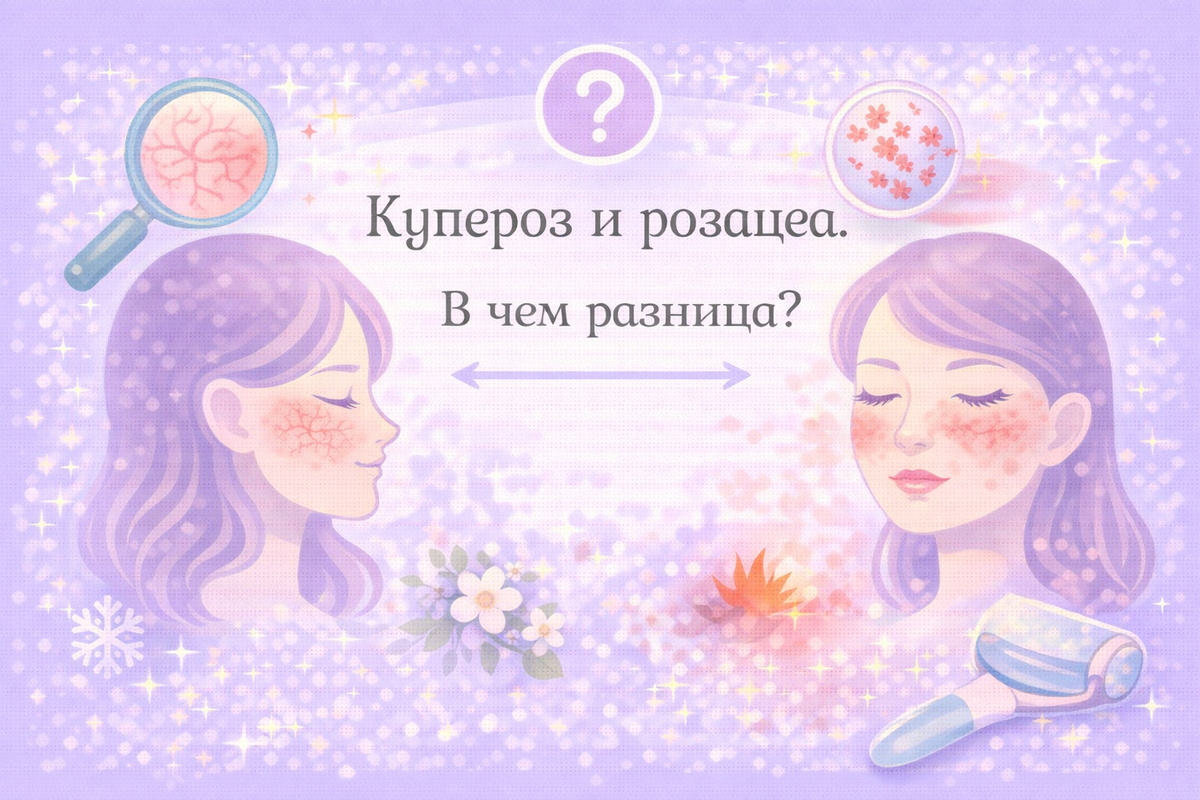«У вас купероз», — говорит косметолог в салоне, разглядывая красные сосудики на ваших щеках. «У вас розацеа», — говорит дерматолог через неделю, глядя на то же самое лицо. Так что же у вас на самом деле? Начнём сразу с главного: купероз — это не отдельное заболевание. Это симптом, проявление, один из признаков розацеа. Точнее — видимые расширенные сосуды на коже, которые выглядят как красная сеточка. Но (И это важное «но».) в бытовой речи и даже в косметологии «куперозом» часто называют просто наличие видимых сосудов на лице, даже если полноценной розацеа нет. Вот тут и начинается путаница. Купероз — это видимая сосудистая сетка на коже. Научное название — телеангиоэктазии. Звучит страшно, но означает просто: мелкие сосуды (капилляры) расширились, потеряли тонус и стали видны сквозь кожу. Как выглядит: — Тонкие красные или фиолетовые «ниточки» на коже — Чаще всего на щеках, крыльях носа, иногда на подбородке — Сеточка, паутинка, «звёздочки» — Не болит, не чешется, просто видна Почему п
