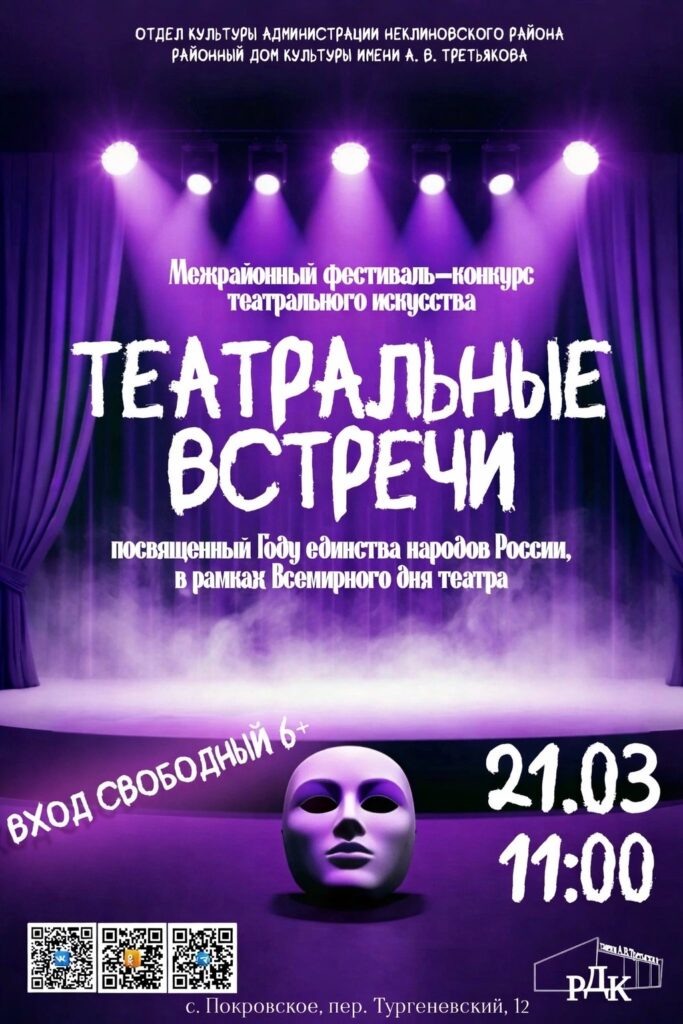 Межрайонный фестиваль-конкурс театрального искусства «Театральные встречи» состоится завтра, 21 марта, В РДК с. Покровское. Начало в 11.00. Вход свободный.