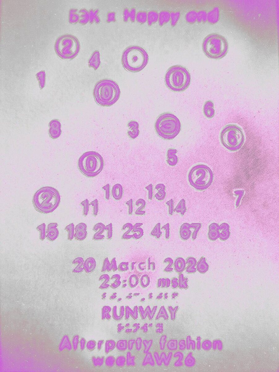 После показов AW26 в Милане и Париже индустрия встречается в Москве, а значит начинается то, ради чего многие и приезжают на недели моды. Afterparty! В этот вечер подиум перемещается на танцпол, модели за DJ пультом, стилисты выходят из бэкстейджа, фотографы оставляют камеры. Sasha Panika • Sonnez • Senitsa (hybrid set) • Kirakira • Dima Noire • Sega Mega Scum • & secret guest Проект курирует БЭК коммьюнити на пересечении моды, музыки и городской культуры. 🎫 Билеты Fc 18+ 📆 20 марта, 23:00 — 04:30 📍Happy End, Москва, Спиридоньевский пер, 9с1