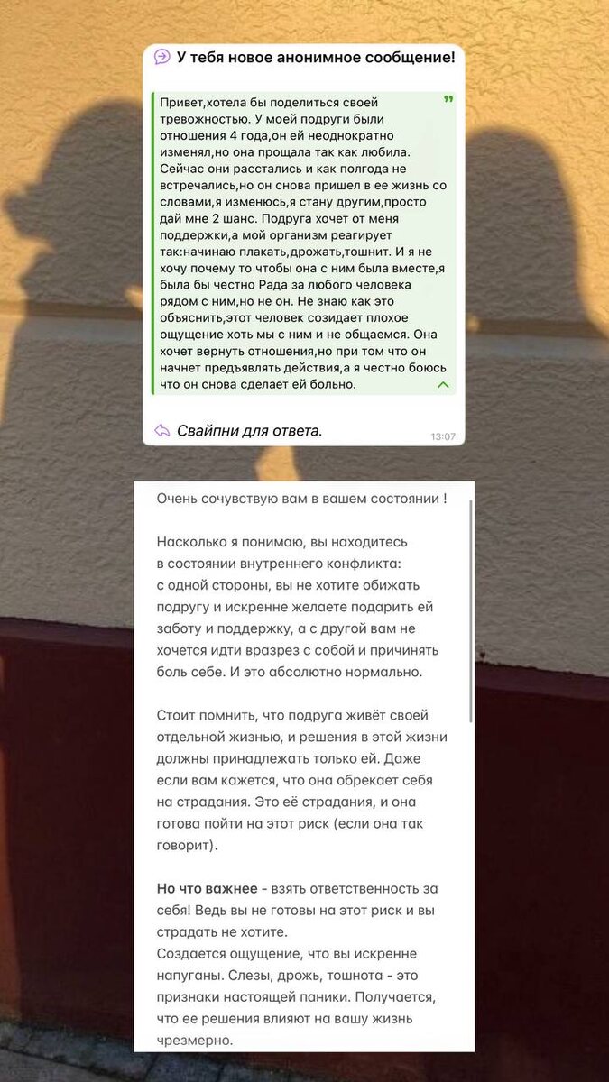 ! 🥹 Думаю, многие из нас были в подобно ситуации с той или другой стороны 💔 Напоминаю, что задавать свои вопросы, делиться мыслями, мнениями и тд можно по этой ссылке: t.me/anonaskbot?start=ki0jl08