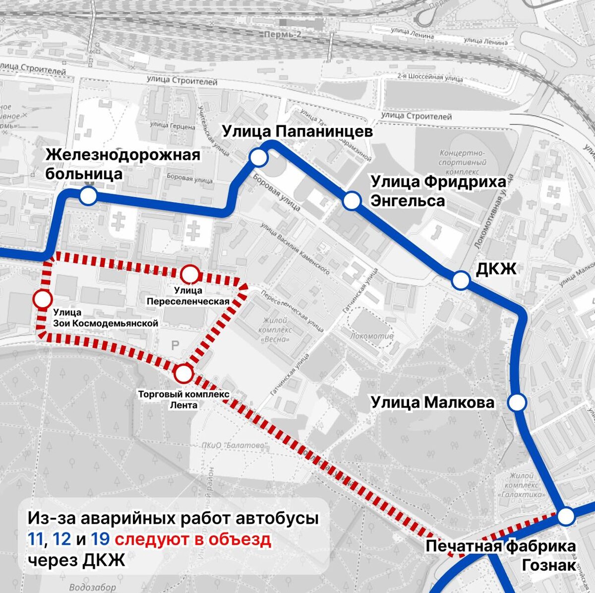 Временные неудобства ожидают пассажиров автобусов, курсирующих до Ивы, Липовой Горы и ДК «Гагарина». Автобусы объедут участок через ДКЖ Схема: дептранс Перми Вечером 20 марта коммунальщики закроют для проезда улицу Подлесную. Движение всех видов транспорта будет запрещено на участке от шоссе Космонавтов до улицы Гатчинской. Участок перекроют с 21:00 20 марта до 07:00 21 марта. По словам коммунальных служб, дорогу закроют на время устранения аварии на насосной станции. В связи с этим автобусные маршруты №11 «М/р Парковый – ул. Сапфирная», №12 «Дворец культуры им. Гагарина – ОАО «ПЗСП» и №19 «М/р Липовая гора – М/р Парковый – Тенториум» следуют в объезд через ДКЖ. В 21:00 перекроют участок, указанный красной линией Скриншот: 2ГИС Ранее краевой минтранс составил рейтинг самых аварийных перекрестков Перми, где в ДТП пострадали 52 человека. Рейтинг по ссылке.