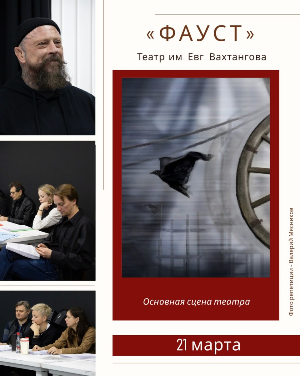 Евг. Вахтангова задумаются о душе Фауста ❤️❤️❤️ Премьера спектакля «Фауст» состоится 21 марта на Основной сцене театра. Философская трагедия «Фауст» хоть и начинается с «Пролога в театре», на драматическую сцену выбирается нечасто. Тем не менее, в последнее время попытки освоить шедевр Гёте следуют одна за другой. В прошлом сезоне Сергей Тонышев выпустил в «Сатириконе» спектакль «Как Фауст ослеп», а этой осенью хореограф Егор Дружинин и режиссёр Максим Кустов представили на суд зрителей «Картины из жизни доктора Фауста», созданные на стыке пластического и кукольного искусств (Театр Образцова). Разумеется, все эти работы возникают независимо друг от друга — режиссёр Андрей Тимошенко подчёркивает, что никаких версий «Фауста», кроме телеспектакля Михаила Козакова (1984), не видел. «„Фауста“ можно поставить один раз в жизни. Это серьёзный текст, к нему подходишь с трепетом и страхом. И это единственное событие на всю жизнь», — рассказывает автор грядущей вахтанговской премьеры. Что кас