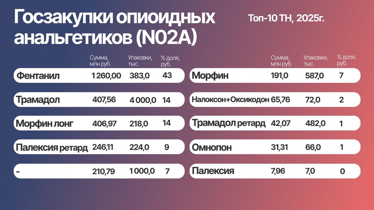 "Почём опиум для народа?" 📊 Рынок опиоидных анальгетиков в структуре госзакупок (N02A) Опиоидные анальгетики - ключевая группа препаратов для обезболивания в стационарах, онкологии, травматологии и паллиативной помощи. Сегмент остаётся одним из наиболее стратегически важных для системы здравоохранения. С 2021 года наблюдается устойчивый рост госзакупок, однако в 2025 рынок демонстрирует признаки стабилизации после активной фазы роста. 📈 Динамика рынка (2021–2025): • 2021 - 1,81 млрд ₽ • 2022 - 2,22 млрд ₽ (+22,7%) • 2023 - 2,43 млрд ₽ (+9,5%) • 2024 - 2,93 млрд ₽ (+20,6%) • 2025 - 2,89 млрд ₽ (−1,4%) 👉 После резкого роста в 2024 рынок вышел на плато. При этом: • Основу рынка формируют льготные закупки (~66%) • Количество контрактов: до 2024 г. наблюдался устойчивый рост числа контрактов (с 4,89 до 7,44 тыс.), однако в 2025 г. зафиксировано снижение до 7,20 тыс. (−3,2%). 💊 Топ-5 ТН (2025): 1️⃣Фентанил — 1,26 млрд руб. (доля 43%), −8,0%. 2️⃣ Трамадол — 407,6 млн руб. (14%), +2