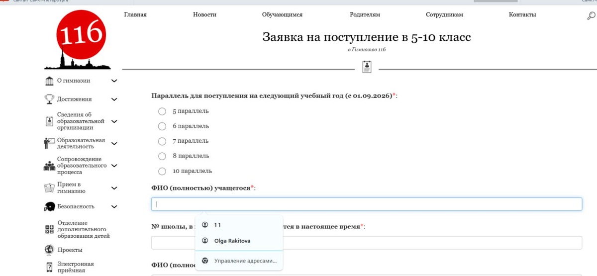 Заявка на поступление в 5-10 класс в Гимназию 116