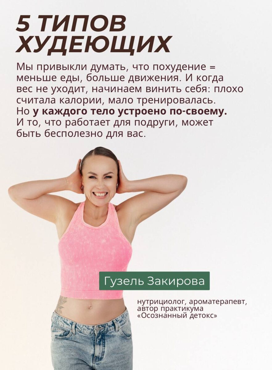 ? Знаете, с чем ко мне приходит большинство женщин? С фразой: «Я уже всё перепробовала: диеты, спорт, подсчёт калорий, даже голодание. А вес либо стоит, либо возвращается с плюсом». Дело в том, что не бывает одной схемы для всех Я много лет разбираю эти механизмы и заметила, что базово есть 5 типажей людей, которые не могут похудеть. И у каждого – свои причины и подводные камни. Я собрала всё это в гайд «5 типов худеющих». В первой части только описание типажей, чтобы вы наконец узнали себя и перестали себя винить. Забрать гайд можно БЕСПЛАТНО в моей рассылке ВК. Позже выйдет вторая часть с пошаговым планом под каждый тип. ЗАБРАТЬ ПЕРВУЮ ЧАСТЬ ГАЙДА ЗДЕСЬ Читайте, изучайте, а потом будем разбираться дальше ❤️