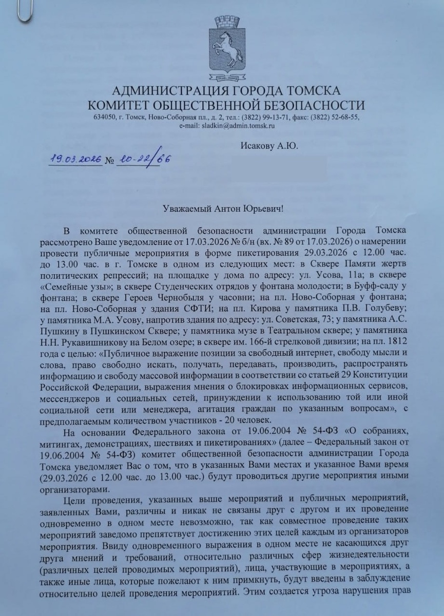 » Общественник Антон Исаков подал в мэрию Томска уведомление о проведении пикета против блокировок в интернете. Чиновники отказали ему под предлогом того, что все 15 площадок якобы уже заняты, но так и не предложили альтернативное место, хотя обязаны были сделать это по закону. Более того, администрация Томска утверждает, что «выражение мнения о блокировках информационных сервисов <…> может расцениваться как публичное распространение под видом достоверных сообщений заведомо ложной информации» (статья 207.1 УК). Кто именно так подумал, чиновники не уточняют. Ответ мэрии подписал глава комитета общественной безопасности Сергей Сладкин. «Это, безусловно, новое слово в административно-правовых отношениях. Протестовать против блокировки интернетов нельзя. Вот почему так важно общаться с органами власти, а то бы мы и не узнали», — отметил Исаков в своём телеграм-канале. Мэрию Томска возглавляет Дмитрий Махиня («Единая Россия»). В последний месяц чиновники в регионах начали повсеместно