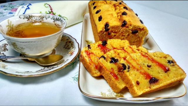 Разрез выглядит празднично, благодаря контрасту желтого теста и красных ягод, а растительное масло в составе делает выпечку мягкой и не даёт черстветь