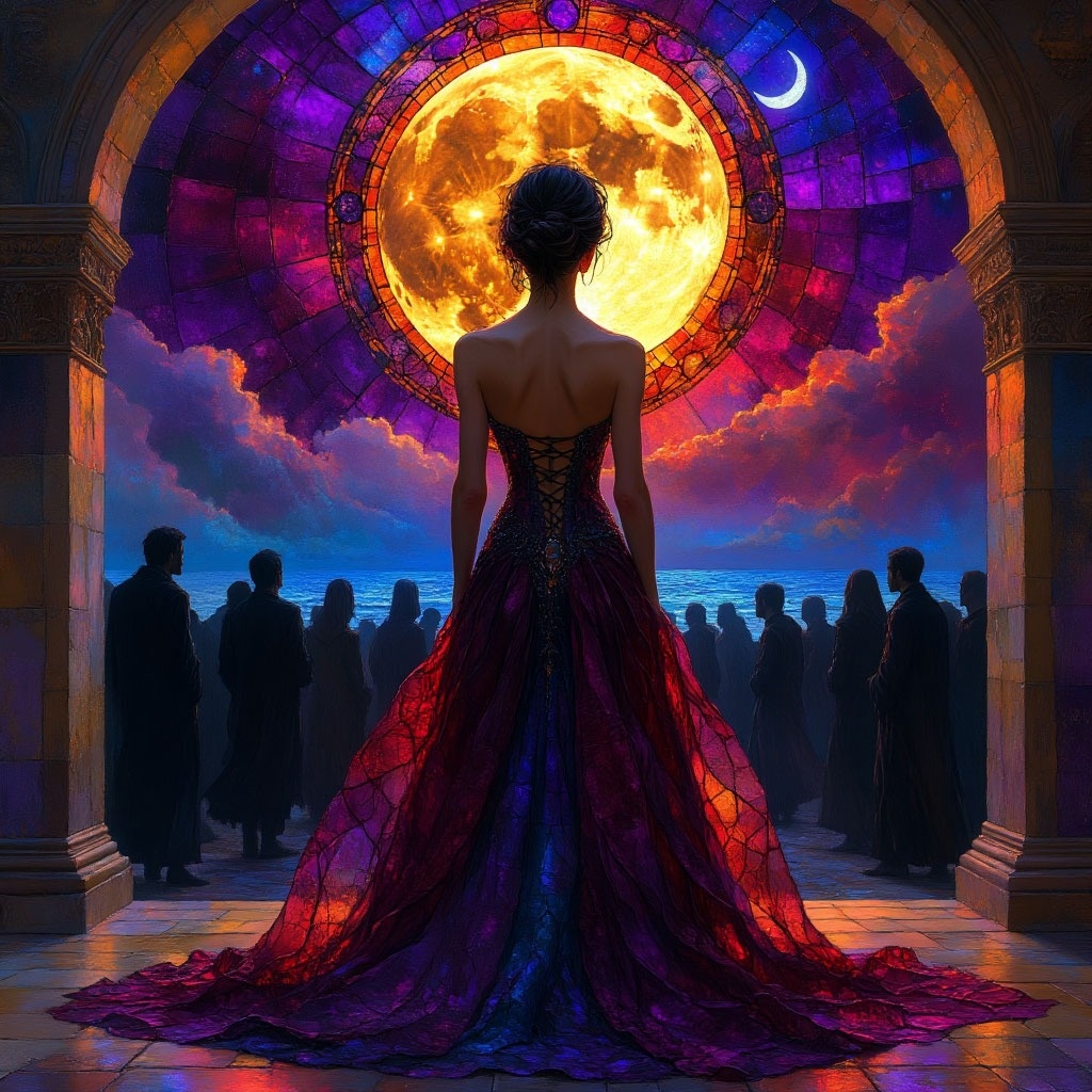 🌑 Бал у Воланда: танец на краю бездны Ночь, полная луны, дрожит над Москвой, и где‑то в сердце города, за стенами обычной квартиры, разворачивается нечто большее, чем бал — это зеркало, в котором искривляется всё: время, плоть, душа. Маргарита ступает сюда не как гостья, а как жертва и жрица одновременно. Ей предстоит пройти сквозь пламя взгляда мертвецов, сквозь шёпот грехов, сквозь тяжесть короны, что давит на виски, будто напоминая: ты выбрала этот путь. Сначала — кровь. Горячая, густая, она льётся на плечи, омывает волосы, стекает по рукам. Не крещение святой водой, нет — иное таинство. Кровь — это дверь. Через неё она входит в мир, где тени не отбрасывают света, а свет не прогоняет теней. Корона на голове — не знак власти, а ярмо: теперь она не просто женщина, она — королева этого безумия. Цепь с пуделем на груди холодит кожу — символ связи с тем, кто стоит за всем этим, с тем, кто не судит, а показывает. Вокруг неё клубится тьма, но не простая — живая, дышащая, наполненная голос