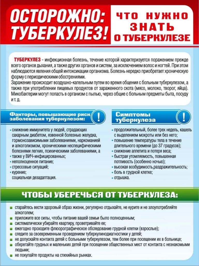 При туберкулезе чаще поражаются дыхательные пути и легкие человека, но он поражает также почки, костную систему, органы зрения, мозг, лимфоузлы, кожу. Часто туберкулез протекает в форме обычной простуды или пневмонии. Основным источником туберкулеза является больной человек, у которого в капле мокроты содержится до 2-3 миллионов микобактерий. При воздушно-капельном заражении палочки попадают в воздух с капельками мокроты при разговоре, чихании и кашле больного, при вдыхании они попадают в легкие. Заражение возможно через предметы обихода больного, при поцелуях, при докуривании чужих сигарет. Можно заболеть при употреблении в пищу молочных продуктов от больных туберкулезом животных.