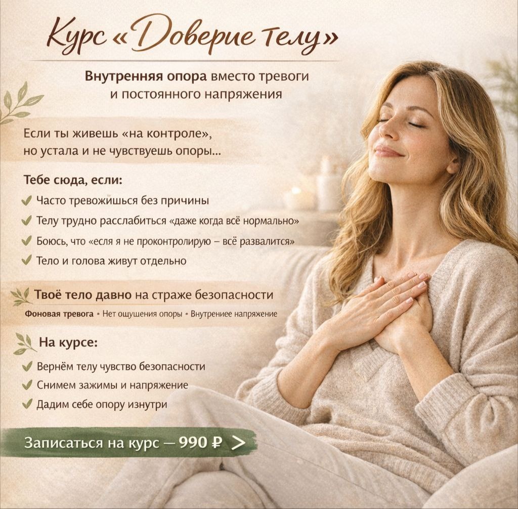 Вы можете и дальше: прислушиваться к каждому симптому… накручивать себя… гуглить диагнозы по ночам… и надеяться, что "само пройдёт". А можете наконец понять, что с вами происходит и вернуть себе спокойствие и опору. 🚀 Старт уже скоро За 10 дней вы пройдёте путь: от "я тревожусь и не понимаю, что со мной" до "я чувствую тело и умею себя успокаивать" Это не теория. Это бережная работа с телом, тревогой и внутренним напряжением. 🔍Курс для вас, если: ✅ Вы часто тревожитесь и живёте в напряжении ✅ Пугаетесь симптомов и накручиваете себя ✅ Не чувствуете тело или не понимаете его сигналы ✅ Вам сложно расслабиться и выдохнуть ✅ Хочется внутренней опоры и спокойствия Что внутри: 🔴 5 глубоких практик - работа с тревогой и телом 🔴 5 дополнительных - на ресурс, расслабление и контакт с собой 🔴 Понимание, как связаны тело, психика и тревога 🔴 Поддержка и сопровождение в процессе ⬇️Практики остаются с вами Результат: ▫️ меньше тревоги и накрутки ▫️ больше спокойствия в теле ▫️пониман