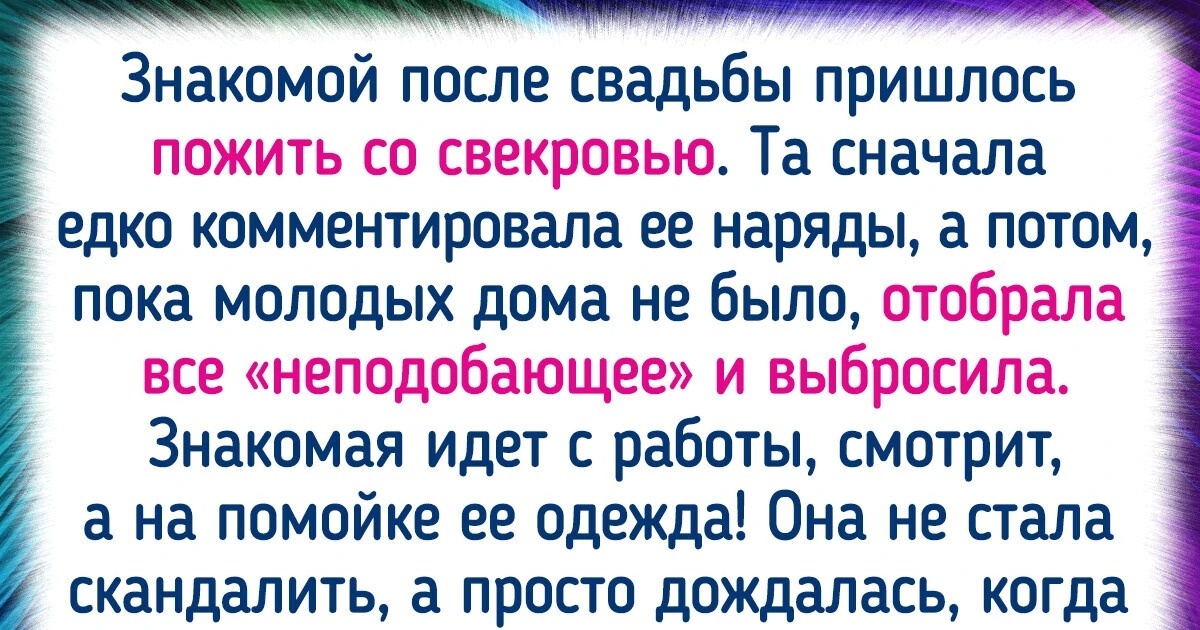 Знакомой после свадьбы пришлось пожить со свекровью. Та сначала едко комментировала ее наряды, а потом, пока молодых дома не было, отобрала все «неподобающее» и выбросила. Знакомая идет с работы, смотрит, а на помойке ее одежда! Она не стала скандалить, а просто дождалась, когда свекровь отправится по делам, собрала ее костюмы и туфли и красиво все разложила на той же помойке. Мама мужа застала уже разбор ее гардероба на мусорке. А на визг свекрови невестка ответила, что привыкла разговаривать с людьми на их языке, поэтому проредила наряды мамы мужа на свой вкус. Как ни странно, свекровь перестала лазить и пересчитывать трусы и майки жены своего сына, но подругами они не стали, да и съехали от мамы скоро. © Елена Афонина / Dzen