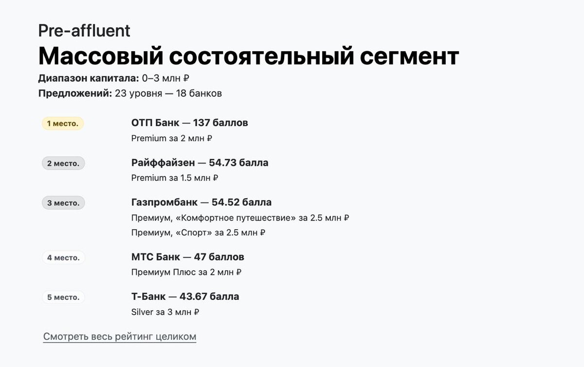🔥 Когда появляется капитал, становятся доступны различные премиальные программы, которые есть у банков. В этот момент карта перестаёт быть просто пластиком, она превращается в набор сервисов, которые для пользователя бесплатные! Мне удалось попробовать тариф "СберПервый" и в текущий момент у меня программа от Тинькофф — обе, кстати, реально понравились. Из того, чем регулярно пользуюсь: • страховки в путешествиях на тебя и близких • компенсации такси и каршеринга • возвраты за рестораны / лаунжи в аэропортах • приоритетное обслуживание • переговорки в разных городах страны (у Сбера) И чем больше у вас капитал — тем больше “бесплатных” плюшек удается получить. К посту прикрепил рейтинг банков под разные уровни капитала. Всего есть 4 категории, начиная капиталом 0-3 млн и заканчивая планкой 25-100 млн. Это уже за нас умные ребята все проанализировали и разобрали, какие банки наиболее выгодные под какой капитал и где можно получить максимум. Кто уже пользуется премиальными программ
