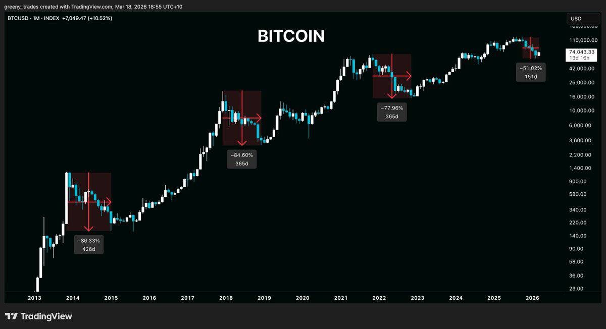 И это главный обман, в который верят инвесторы Смотрите, что показывает история, если убрать эмоции и оставить только цифры. Биткоин уже больше 10 лет двигается по очень похожему таймингу циклов: Падение от пика до дна: 2013 → 2015: ~410 дней 2017 → 2018: ~363 дня 2021 → 2022: ~376 дней Среднее: ~383 дня Глубина падения: 2011: -93% 2015: -85% 2018: -84% 2022: -77% И важный момент, который многие игнорируют — фаза накопления: 2015: ~15 месяцев боковика 2018: ~16 месяцев 2022: аналогично Теперь давайте трезво посмотрим, где мы сейчас. Прошло около 5 месяцев с октябрьского пика. Падение — всего ~42% от ATH. Что это значит? Если цикл снова «рифмуется» (а он это делает каждый раз), то: — по времени мы даже не прошли половину медвежьего рынка — по глубине падения мы вообще далеки от исторических значений Да, есть фактор институционалов, и я тоже считаю, что падение может быть мягче, чем раньше. Но это не отменяет саму структуру цикла. Среднее дно формируется примерно через 383