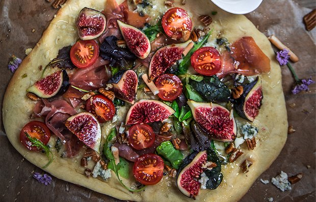 Иногда самые запоминающиеся блюда появляются благодаря неожиданным ингредиентам. Пицца с инжиром — яркий пример того, как сладкие фрукты могут идеально дополнить аромат сыра и хрустящее тесто. Наш шеф-повар любит повторять: «Настоящая пицца — это гармония вкусов: немного сладости, щепотка соли и аромат свежей выпечки». Инжир во время запекания становится мягким и слегка карамельным, создавая удивительно нежное сочетание с расплавленным сыром. ✨ Секрет шеф-повара: если оставить тесто подниматься дольше — около 2 часов — структура станет более воздушной, а корочка после выпечки получится особенно хрустящей. 2. Пока тесто подходит, подготавливаю начинку. Инжир аккуратно мою и нарезаю тонкими дольками. Моцареллу режу небольшими кусочками, а мягкий сыр оставляю небольшими ложечками — так он красиво распределится по поверхности пиццы. 3. Подошедшее тесто слегка обминаю и раскатываю в круг толщиной примерно 3–4 мм. Перекладываю основу на противень с пергаментом. Сначала смазываю поверхность н