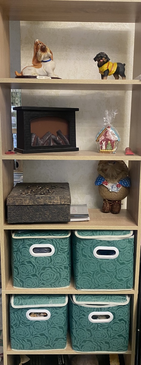 Это мне не мешает, пусть делает как ей хочется, не всегда же ей жить по моему, хотя я специально для неё купила этажерку и коробочки, в которых лежит её добро. Она каждый раз удивляется, как у неё всего много, и она не знала.