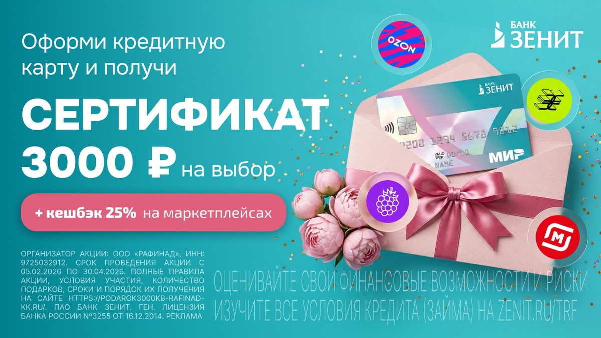 ⚡️ Акция действует при оформлении карты по специальной ссылке. ☑️ Условия акции. 💳 Что можно получить: 1️⃣ 🎁 Сертификат 3 000₽ (Ozon/WB/ЗЯ/Магнит) Чтобы получить сертификат: – Оформить карту по специальной ссылке с 05.02.2026 по 30.04.2026 – Потратить от 500₽ заёмных средств в течение 30 дней после получения карты – Получить сертификат по SMS в течение 60 дней после выполнения условий 📩 Контакты партнёра: ZNT.certificate@rafinad.io 2️⃣ 🛍 Кешбэк до 25% на маркетплейсы – Действует 30 дней после получения карты – Категории MCC: (5300, 5262, 7278) – Кешбэк макс. 1 000₽ Кому подойдёт: ✔️ Гражданам РФ 21-69 лет ✔️ Без действующей кредитной карты или предодобренного решения в Банке ЗЕНИТ ✔️ Тем, кто не обращался в банк за кредитом последние 30 дней 📌 Итого получаем бонус по кредитке: ✔️ 4 000₽ – по акции с кешбэком (1 000₽ кешбэк + 3 000₽ сертификат) Всем профита🔥 Если было полезно – ставьте лайк и подписывайтесь👍🏻 Подобные разборы и обновления публикую в Telegram-канале и MAX👈