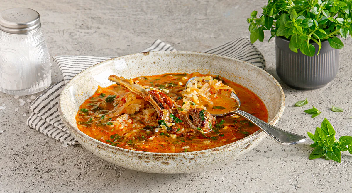 Есть блюда, которые невозможно забыть после первого кусочка. Харчо на бараньих ребрышках — как раз такое. Насыщенный, пряный, с лёгкой кислинкой — этот суп буквально обволакивает теплом. Наш шеф-повар всегда говорит: «Главная сила харчо — это бульон и специи. Бараньи ребрышки придают ему глубину, а сочетание пряностей делает каждую ложку неповторимой». 1. Сначала готовим бульон. Бараньи ребрышки тщательно промываем, разрезаем на порционные куски и кладём в кастрюлю. Заливаем холодной водой и ставим на средний огонь. Когда вода закипит, аккуратно снимаем пену и добавляем лавровый лист. Варим мясо 50–60 минут до мягкости. ✨ Секрет шеф-повара: обжарьте ребрышки на сухой сковороде перед варкой — это усилит аромат бульона и придаст ему лёгкую золотистую нотку. 2. Пока варятся ребрышки, готовим овощи. Лук нарезаем мелкими кубиками, морковь натираем на крупной тёрке. Разогреваем растительное масло на сковороде, сначала обжариваем лук до прозрачности, затем добавляем морковь и готовим ещё 3–4