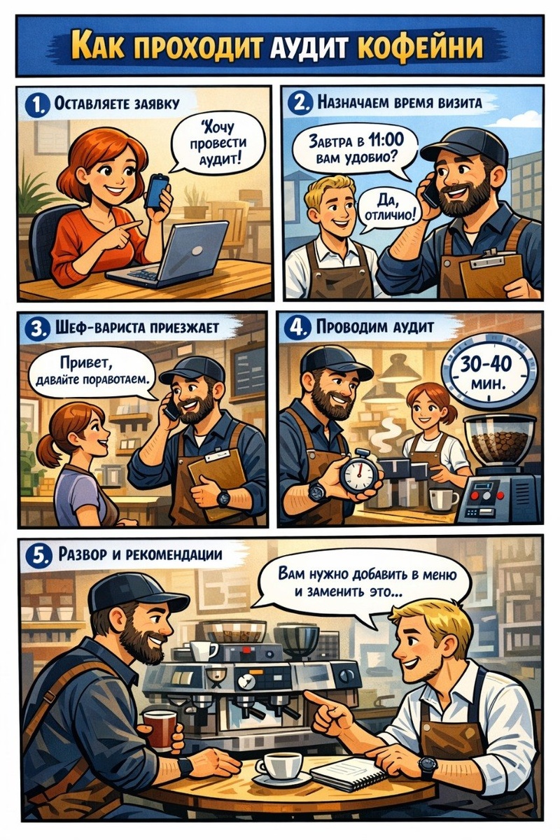 Многие думают, что аудит — это долго, сложно и мешает работе. На практике — всё проходит быстро и прямо в процессе работы кофейни. Процесс очень простой 1️⃣ Вы оставляете заявку 2️⃣ Мы связываемся с вами и согласовываем удобное время 3️⃣ Шеф-бариста приезжает в кофейню 4️⃣ Проводит аудит в реальных условиях (примерно 30–40 минут) 5️⃣ Вы получаете разбор и рекомендации Важно Аудит проходит без остановки работы. Мы смотрим не «в теории», а как всё происходит на самом деле: — как готовится кофе — как работает бариста — как устроен бар — как ведёт себя гость Именно поэтому аудит даёт честную картину. Что вы получаете после Не абстрактные советы, а конкретные вещи: • список проблем, которые мешают зарабатывать • рекомендации по напиткам (вкус, стабильность) • советы по работе бариста • корректировки меню • рекомендации по оборудованию и процессам Самое ценное! После аудита становится понятно: — где вы теряете деньги — где замедляется работа — где не дожимаются продажи И главно