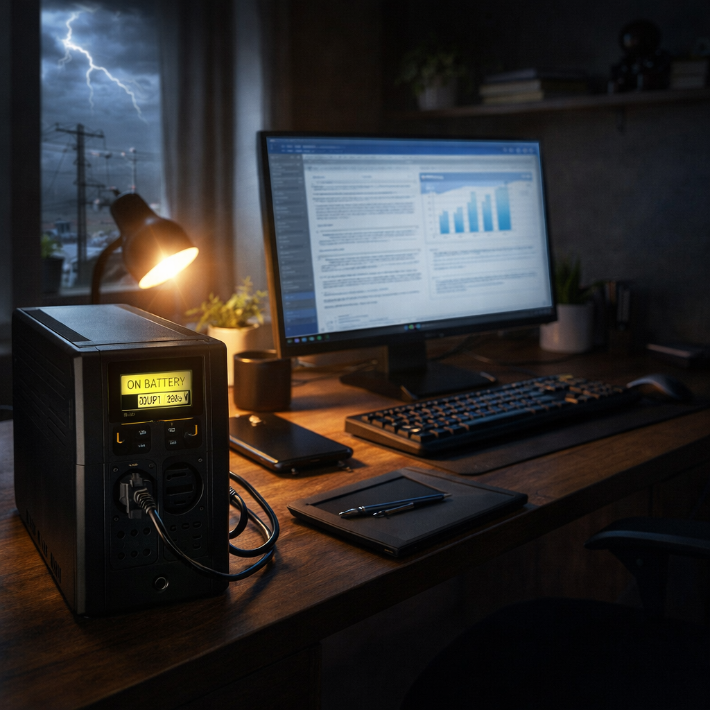 ИБП для домашнего офиса — не статья расходов, а страховка от потери данных и порчи техники. Для большинства рабочих мест дома достаточно line-interactive устройства на 850–1000 ВА с функцией AVR. Подключать к нему нужно только критичное оборудование: ПК, монитор, роутер.
