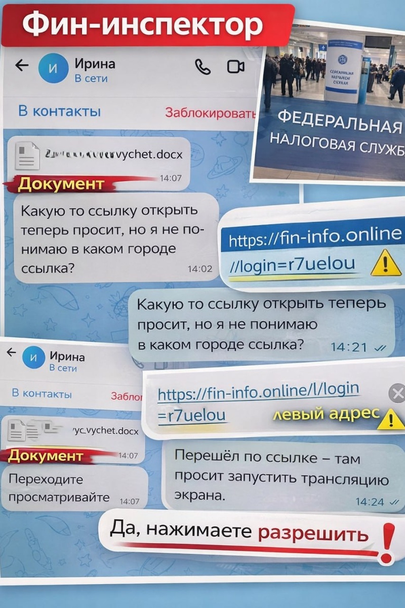 У вас крупный вычет». Я не заблокировал. Я посмотрел, как вас будут ломать. Сценарий, который сейчас крутят по бизнесу. Пишут в мессенджер: «Инспектор из 22 налоговой. По вашему ООО пришёл документ. Сумма внушительная». Кидают файл: vasheooo_vychet.docx - на самом деле это не файл а завуалированная ссылка. На сайте нет документа. 👉 Есть просьба включить трансляцию экрана. Я спрашиваю: «Это обязательно?» Ответ: «Да, нажимаете разрешить» Дальше добавляют «доверия»: 👉 «Нужно пройти биометрию, чтобы открыть документ» 💀 Что это на самом деле Это не ФНС. Это не документ. Это интерактивная атака: не воруют пароль. не шлют вирус. 👉 вас заставляют показать экран и сделать всё самим 🧠 Разбор схемы по шагам 1. Легенда «Налоговая», «инспектор», «ООО» – максимальный уровень доверия. 2. Триггер «Сумма внушительная» → страх и срочность. 3. Техническая «проблема» «Файл не открывается» → ломают привычный сценарий. 4. Перевод на свою площадку Левый домен вместо nalog.ru. 5. Ключевой момент 👉