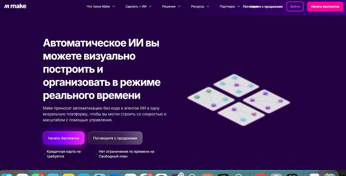 ): Make – удобный интерфейс для работы с БД без написания внутреннего кода. Это визуальное программирование. Мы описываем сценарии, которые могут выполнять рутинные задачи – это передача данных, отправка уведомлений, обновление БД. Зачем это нужно? 1. Автоматизация рутины, экономит человеческие ресурсы, а соответсвенно экономия бюджета 2. Оптимизация передачи данных для того, чтобы получать данные здесь и сейчас 3. Широкие возможности интеграции – поддержка 100-ни приложений, которые создают удобных UX 4. Упрощение работы с данными – больше информации о клиентах.– больше информации об его опыте – больше решений мы можем предложить.– основную боль закрыть и заработать больше денег 5. Гибкость и масштабируемость – можем масштабировать вместе с бизнесом. Самое основное УТП – это отсуствия кодирования, есть возможность роста для малого и среднего бизнеса.