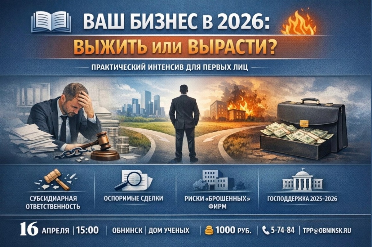 Как не потерять личное имущество и найти ресурсы для роста при дорогих кредитах? Разберем на закрытой экспертной встрече для первых лиц в Обнинске! В программе встречи: 📍 Субсидиарная ответственность: когда директор платит сам. 📍 Оспаривание сделок: как сохранить активы компании. 📍 «Брошенные» фирмы: почему ЕГРЮЛ не спасает от долгов. 📍 Навигатор по господдержке на 2025-2026 гг. Главная фишка: Интерактивный разбор ваших кейсов. Опишите ситуацию при регистрации и получите решение от экспертов прямо в зале. 16 апреля | 15:00 Обнинск, Дом Ученых, Библиотека (2 этаж) Цена: 1000₽ 🔗 Купить билет: https://qtickets.ru/event/223921 Членам Союза "Обнинская торгово-промышленная палата" — бесплатно! (при регистрации указать ФИО и должность) Записаться: 📞 (48439) 5-74-94 📩 tpp@obninsk.ru 👍 Подписаться | Ваша реклама