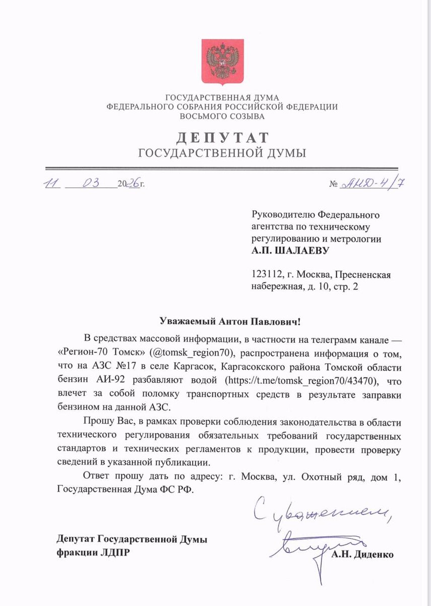 ! Поступала информация о том, что в нашей стране ситуация с топливом стабильная и качество соответствует норме. Однако в Томской области, в селе Каргасок, разворачивается совсем другая история — и контраст получается шокирующим. Местные водители бьют тревогу: заправка №17 вместо бензина заливает в баки обычную воду. После посещения этой АЗС автомобили проезжают всего пару километров и глохнут. Один из пострадавших слил из бака около 4 литров воды. На данный момент счет сломавшихся машин идет уже на десятки. Именно в связи с этим депутат Государственной Думы Алексей Николаевич Диденко направил официальный запрос руководителю Федерального агентства по техническому регулированию и метрологии. Парламентарий требует провести проверку соблюдения законодательства, государственных стандартов и технических регламентов в отношении качества продукции на данной заправке. На фоне сообщений о благополучии с топливом у соседей особенно остро звучат вопросы: как вода оказалась в бензине, кто допус