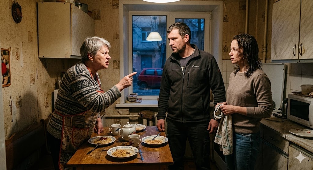 Свекровь демонстративно швырнула ложку в раковину и удалилась в гостевую комнату. Максим остался один на один с остывшими макаронами.
