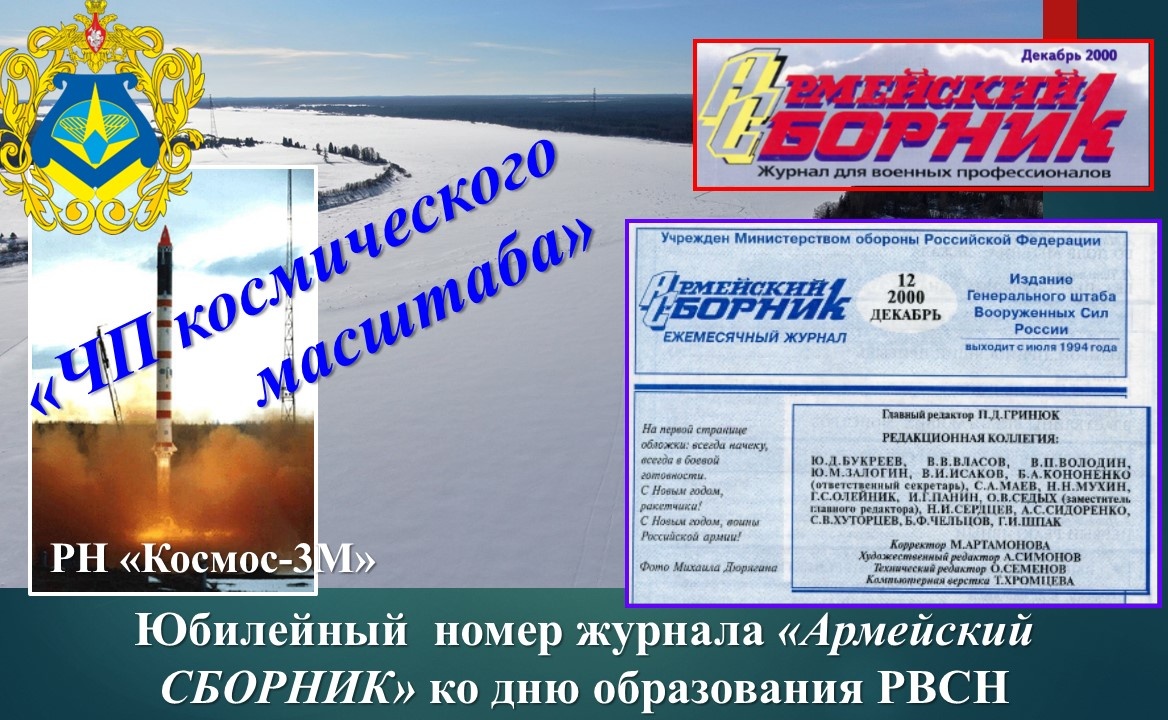 Юбилейный номер журнала «Армейский СБОРНИК» № 12 от 2000 г. со статьей "ЧП космического масштаба", подготовленной редакцией журнала по заказу пресс-службы Главного штаба РВСН ко дню образования РВСН