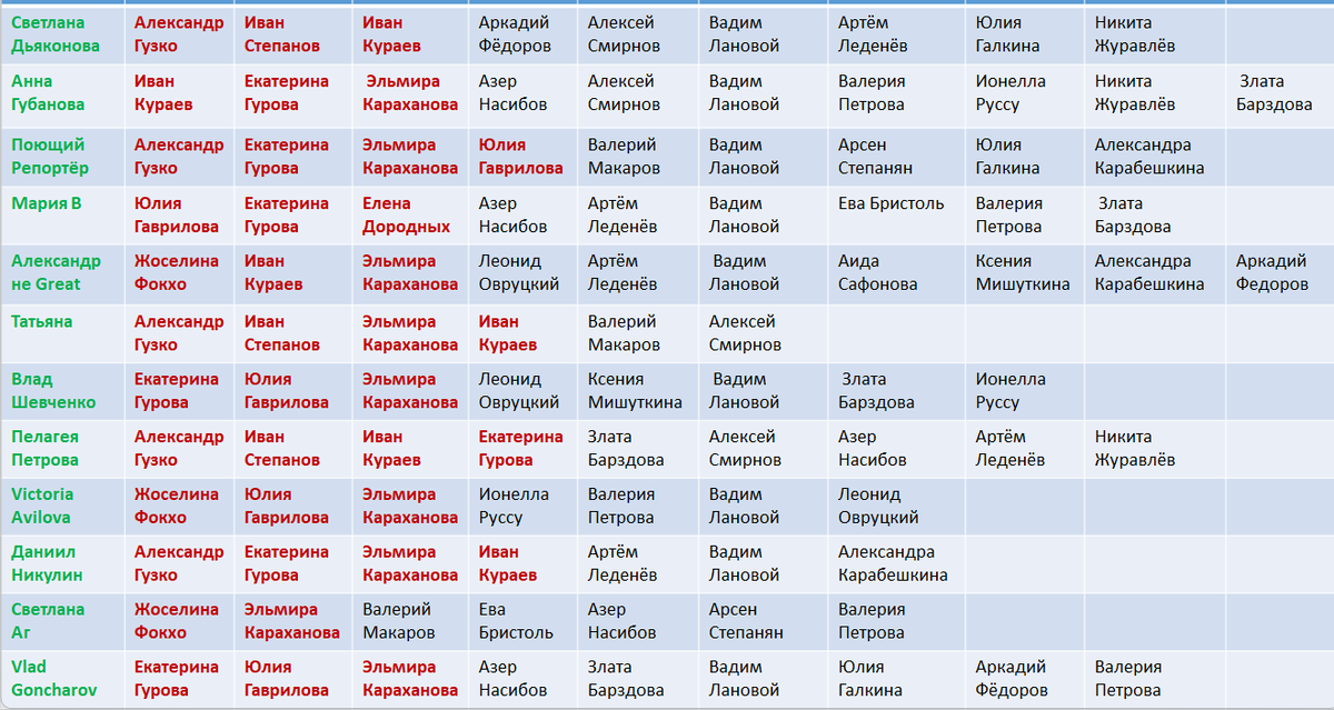 А мы смотрим "Голос", к тому же сами играем. Здравствуйте! Читатели (все, кто хотел) этого канала набрали "свои" команды, чтобы смотреть шоу было интереснее. А те игроки, в командах которых окажется победитель, получат диплом "Музыкальный детектив". В прошлый раз у нас уже были первые потери, на этот момент таблица выглядит так: И посмотрим, как у нас пойдут дела дальше. Предупреждаю, что дуэлянтов, которых нет в наших командах, я не упомяну. Не потому что вредничаю, а потому что не успеваю. Прошу прощения. "Призрак оперы". Ого! Вот это произведение даже я люблю, спасибо за выбор. Мне показалось, что Арсен был убедительнее. Наставник выбрал Арсена Степаняна. И я поздравляю наших девочек, которые взяли в свои команды Арсена. "Они знакомы давно" (А. Косинский, Э. Ширяев). Мне очень-очень нравится эта песня в оригинале, у этого дуэта она получилась совсем другой. В целом, получилось интересно, но что-то в припеве мне не понравилось. Наставник выбрал Женю Веренич. Из нас никто его н