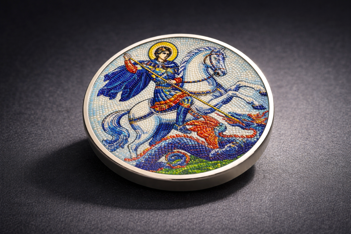 В различных музеях можно встретить удивительные примеры мозаичного искусства — сложные изображения, собранные из сотен мельчайших элементов. Зарубежные производители также экспериментируют с подобной эстетикой в нумизматике. И мы не могли обойти этот визуальный эффект стороной. Наша команда решила освоить этот прием и адаптировать его под собственное производство. Сегодня расскажем, в чем особенность такой монеты, и почему этот эффект не так прост, как кажется. Эффект мозаики на монете — это не просто визуальный прием, а сочетание рельефа и цвета, где изображение формируется из множества отдельных элементов. Каждый «фрагмент» — это отдельная часть композиции с собственным рельефом, с индивидуальной проработкой цвета, с четкой геометрией. Визуально это создает ощущение, будто изображение собрано из множества деталей, а не нанесено на поверхность. В нашей разработке этот эффект реализован с обеих сторон монеты.