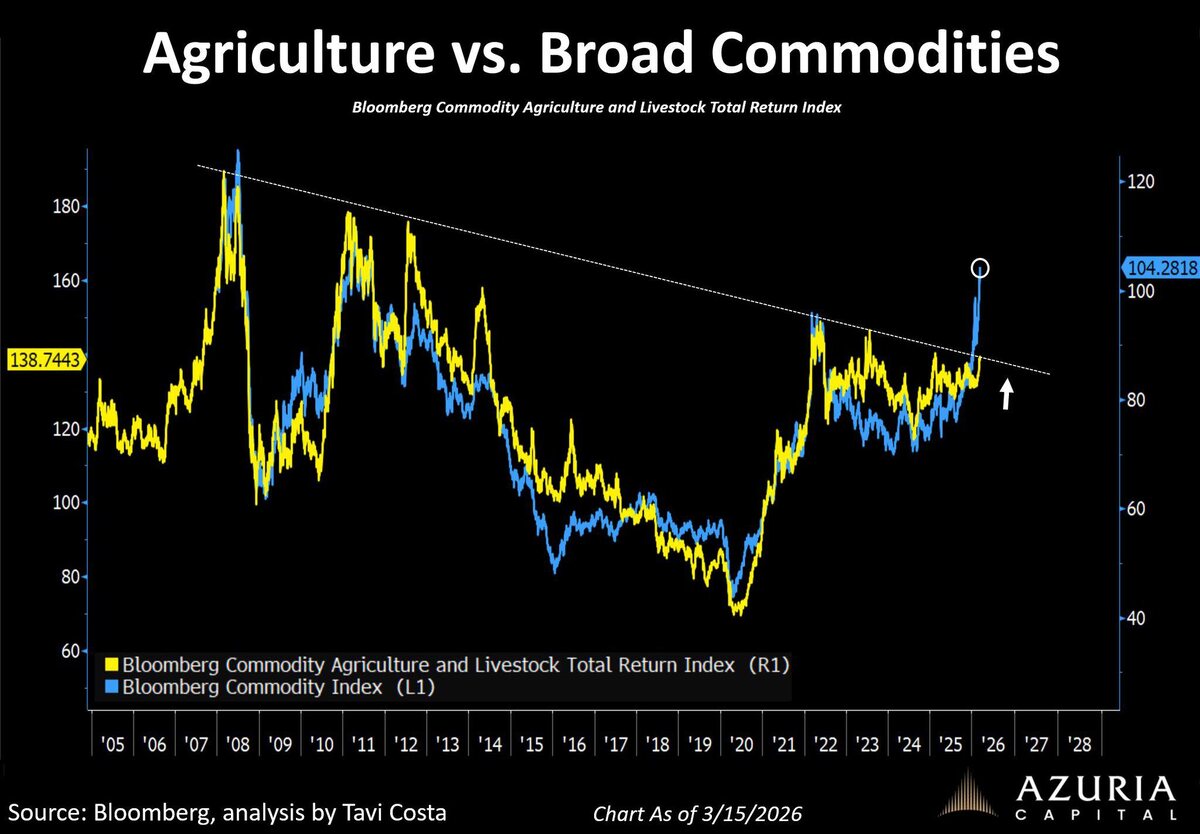 Также этот график показывает корреляцию цен сырьевых и сель хоз товаров.