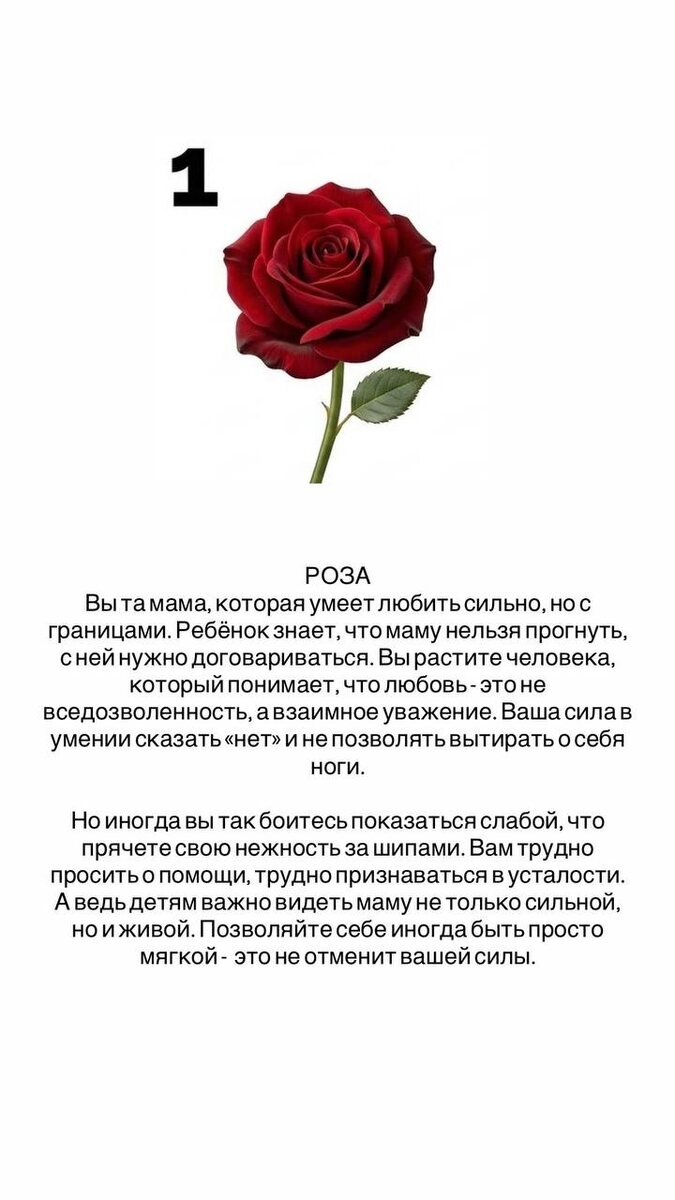 👈 🌸Если откликается не один, а сразу несколько образов, то это значит, что ваше материнство объёмное, живое, настоящее. Редко кто, на самом деле, умещается в один цветок. Мы можем быть нежной лавандой с детьми, когда им нужно утешение, и колючей розой, когда приходится защищать границы, и можем светить подсолнухом на детском празднике и тихо цвести ландышем, наблюдая за спящим ребёнком. Если вы выбрали несколько, то скорее всего, в вас живут все эти энергии. Просто в разные дни, в разных ситуациях проявляется то одна, то другая. А если сомневались и так и не выбрали, возможно, вы давно не спрашивали себя, чего хотите, что чувствуете, какая вы сегодня. И это тоже ответ. Может быть, именно с этого и стоит начать, спросить себя: «А какая я сегодня?»