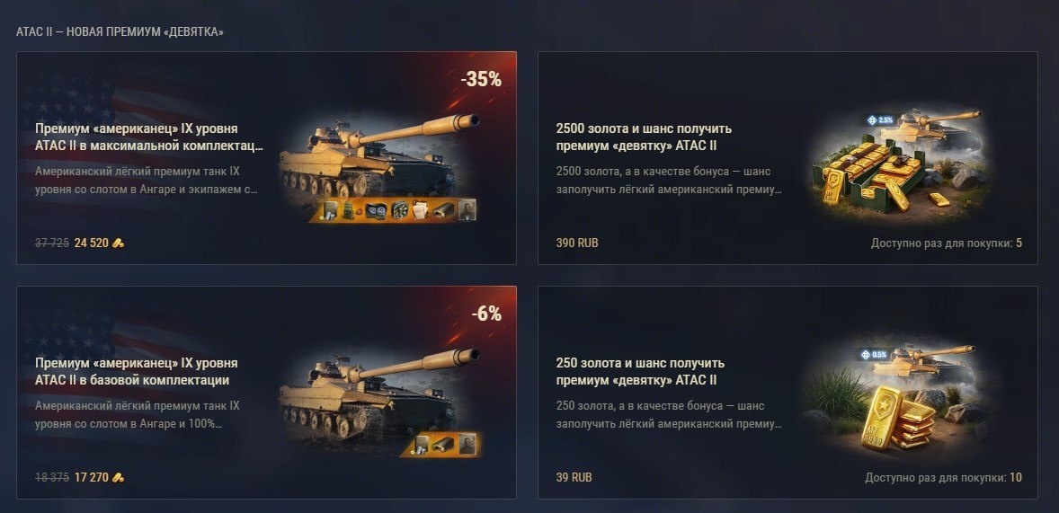? Получайте! 🇺🇸 ATAC II - легкий прем танк 9 уровня. 3 варианта его получения: 1️⃣Прямая покупка. Можно забрать машину со скидкой до 35%. 2️⃣Активировать промокод , выполнить БЗ и получить либо 100к 💰, либо ATAC II. Вероятность: 0.1%. 3️⃣Купить пакеты с 250💰 и/или 2500💰и испытать удачу, так как бонусом также можно получить ATAC II. Вероятность 0.5% и 2.5% соответственно.