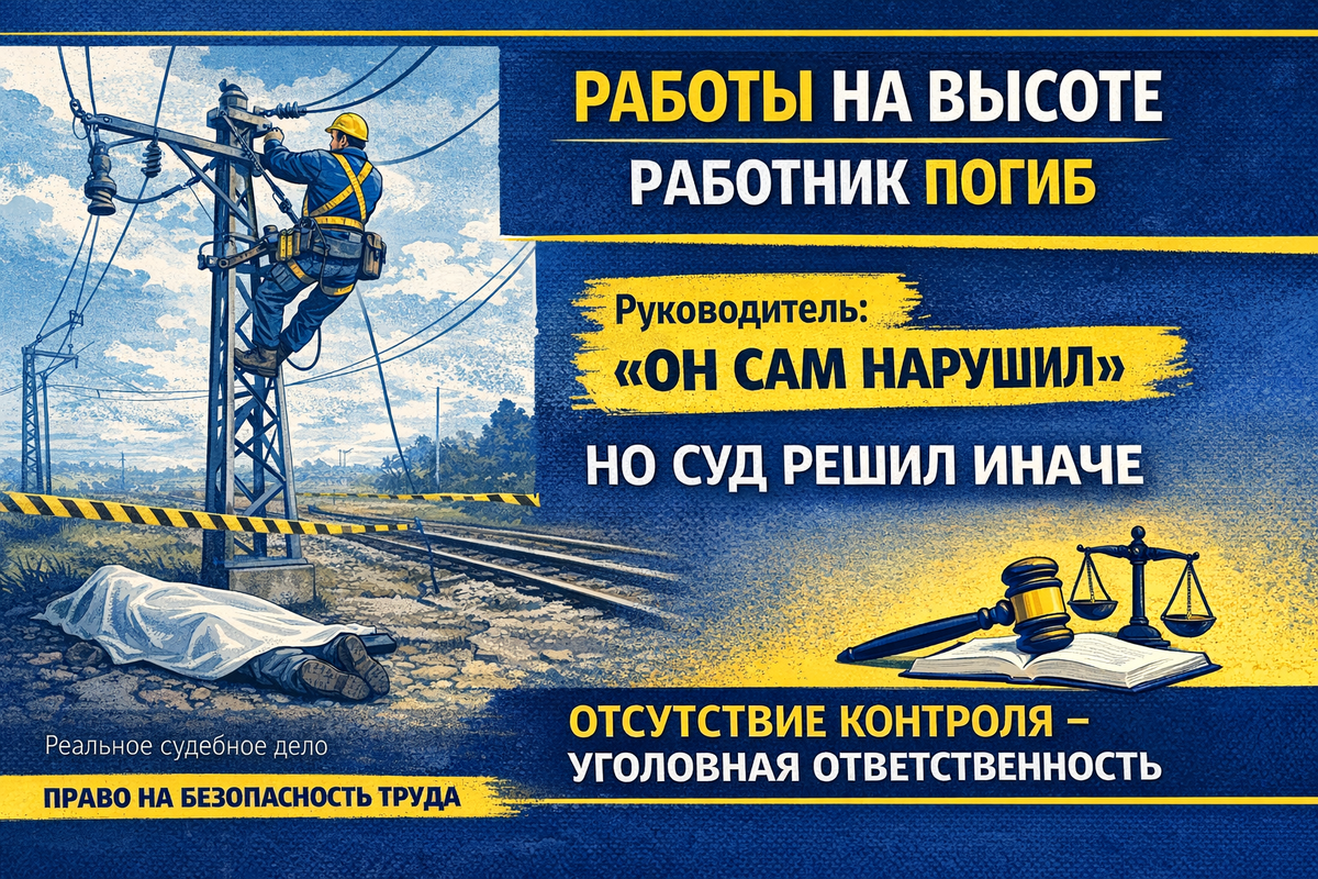 Дело № 1-26/2025 (1-448/2024) от 27 марта 2025 года. Суд (по материалам приговора, опубликованного в базе судебных актов) Обстоятельства происшествия: Работы выполнялись на объекте железнодорожной инфраструктуры. Бригада электромонтёров выполняла работы, связанные с обслуживанием контактной сети — это работы повышенной опасности, фактически работы на высоте и вблизи источника напряжения. В процессе работ: - работники были допущены к выполнению задач - работы проводились в зоне повышенной опасности - контроль за безопасностью со стороны руководства не был обеспечен в полном объёме. В результате один из работников получил поражение электрическим током и погиб. Кто был ответственным лицом Суд установил, что ответственным был: 👉начальник района контактной сети На него были возложены обязанности: - обеспечивать соблюдение требований охраны труда - организовывать безопасное выполнение работ - осуществлять постоянный контроль за работниками. Он знал требования безопасности, но: - допустил ра